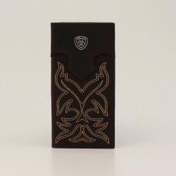Your young cowboy will like having a wallet just like dad’s. Ariat rodeo wallet in medium brown leather with boot stitch design. Ariat concho.