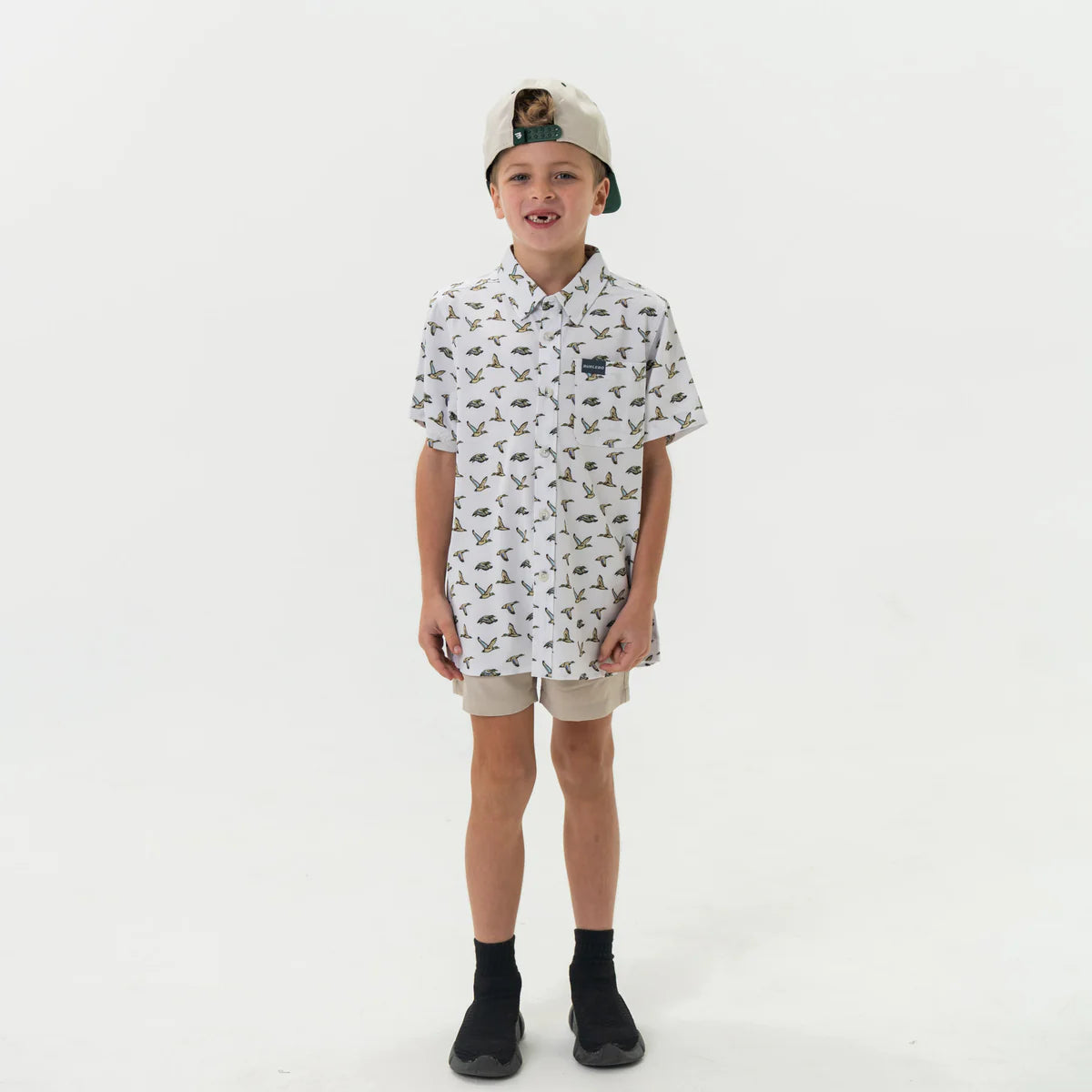 Burlebo® Kid's Performance Button Up Flying Mallard Ducks White Y-PBU-FMD