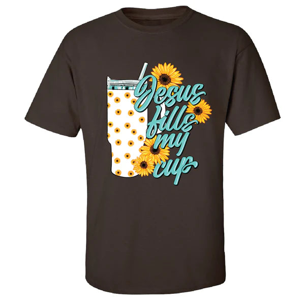 Join the sunny side and stay trendy with our 100% cotton "Jesus Fills My Cup" tee. Available in both adult and youth sizes, this cute tee features a fun sunflower design. Let Jesus fill your cup and your wardrobe!