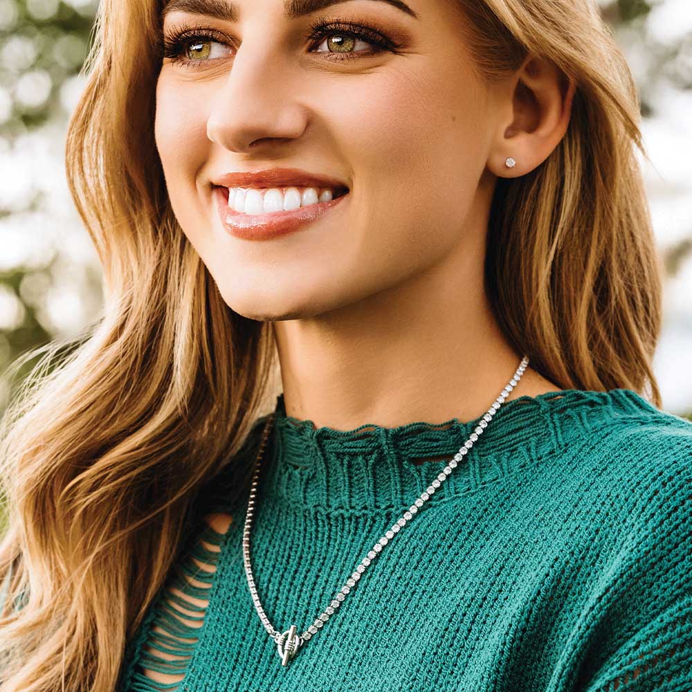 The Montana Silversmiths® Touch of Starlight Jewelry Set JS6129 features an elegant design with clear cubic zirconia crystals adorning the 18.75-inch silver-plated necklace and matching stud earrings. Crafted with a brass base and protected by Montana Armor to prevent tarnish, this set combines durability with refined sparkle. The necklace’s silver tone toggle clasp adds a distinctive touch, while the hypoallergenic post backs on the earrings ensure comfortable wear. Ideal for those seeking subtle brilliance, this set is a sophisticated addition to any jewelry collection.
