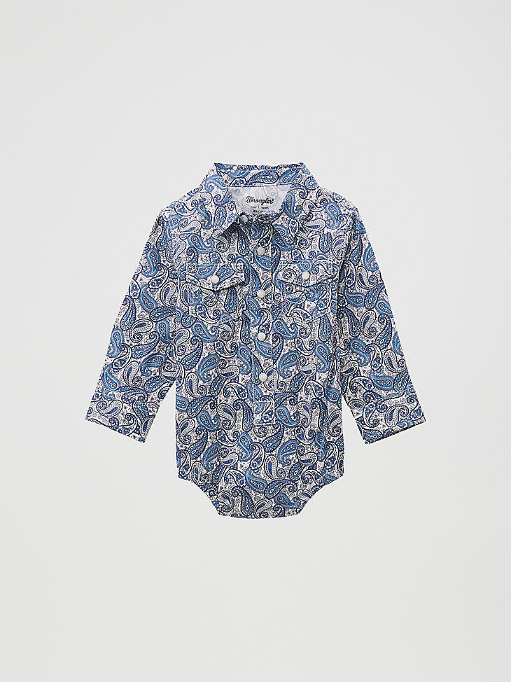 Crafted for authentic Western style, this long-sleeve bodysuit features classic Wrangler® snap-flap pockets and a distinctive Western yoke on the back. Designed with practical details including a spread collar, snap closures at the front and cuffs, and a convenient snap seat closure for quick diaper changes, it combines traditional cowboy aesthetics with everyday functionality for your little one.