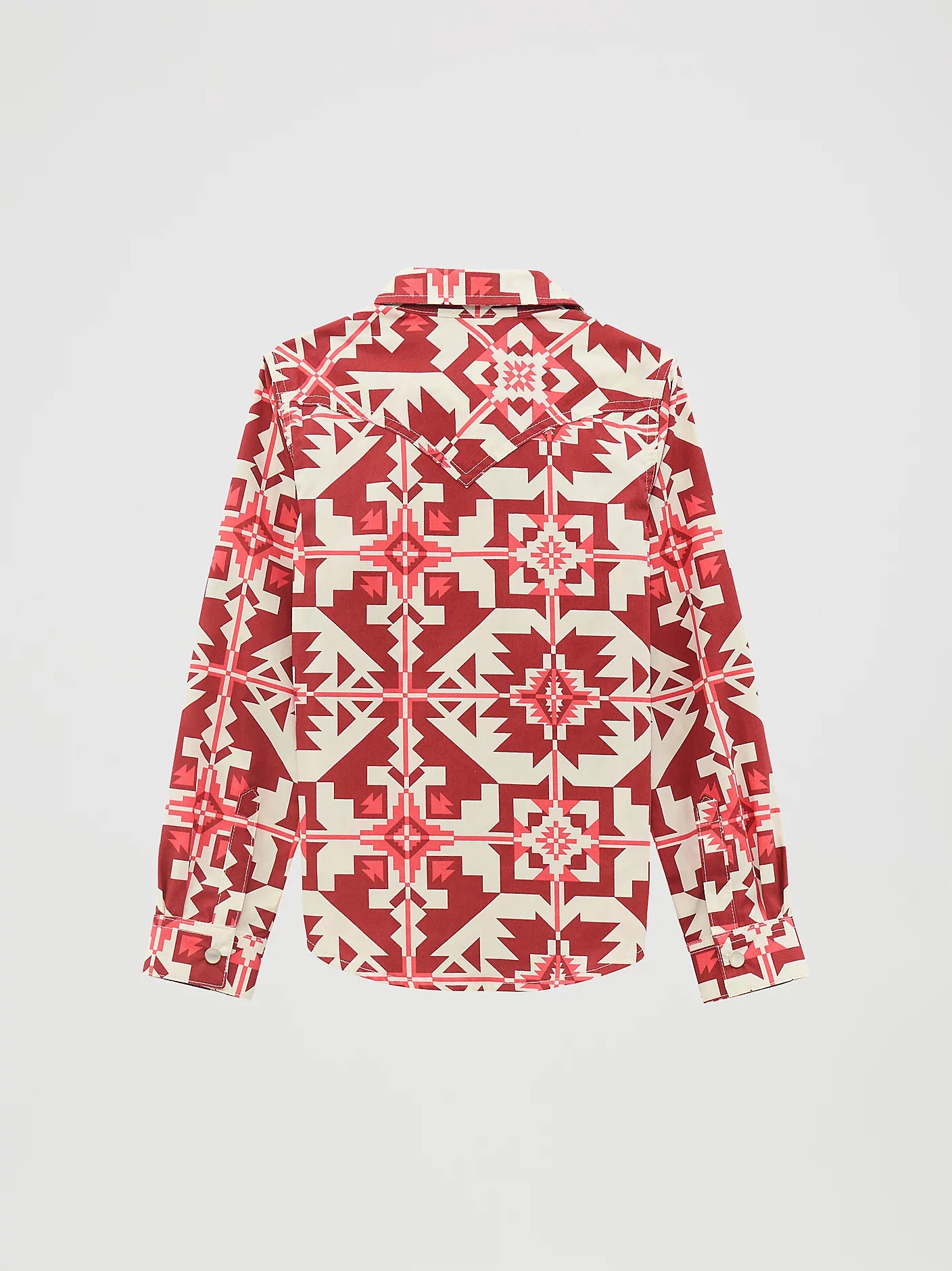 Wrangler® brings trusted Western style to your little cowgirl with this long-sleeve geo print snap shirt. Crafted with authentic features like front and back Western yokes, pearl snap buttons, and snap flap chest pockets with signature 'W' stitching, it offers both comfort and classic design. The spread collar and single snap cuff closure complete a look that’s perfect for active kids who love Western tradition with a modern twist. Durable and stylish, this shirt keeps her ready for any adventure.