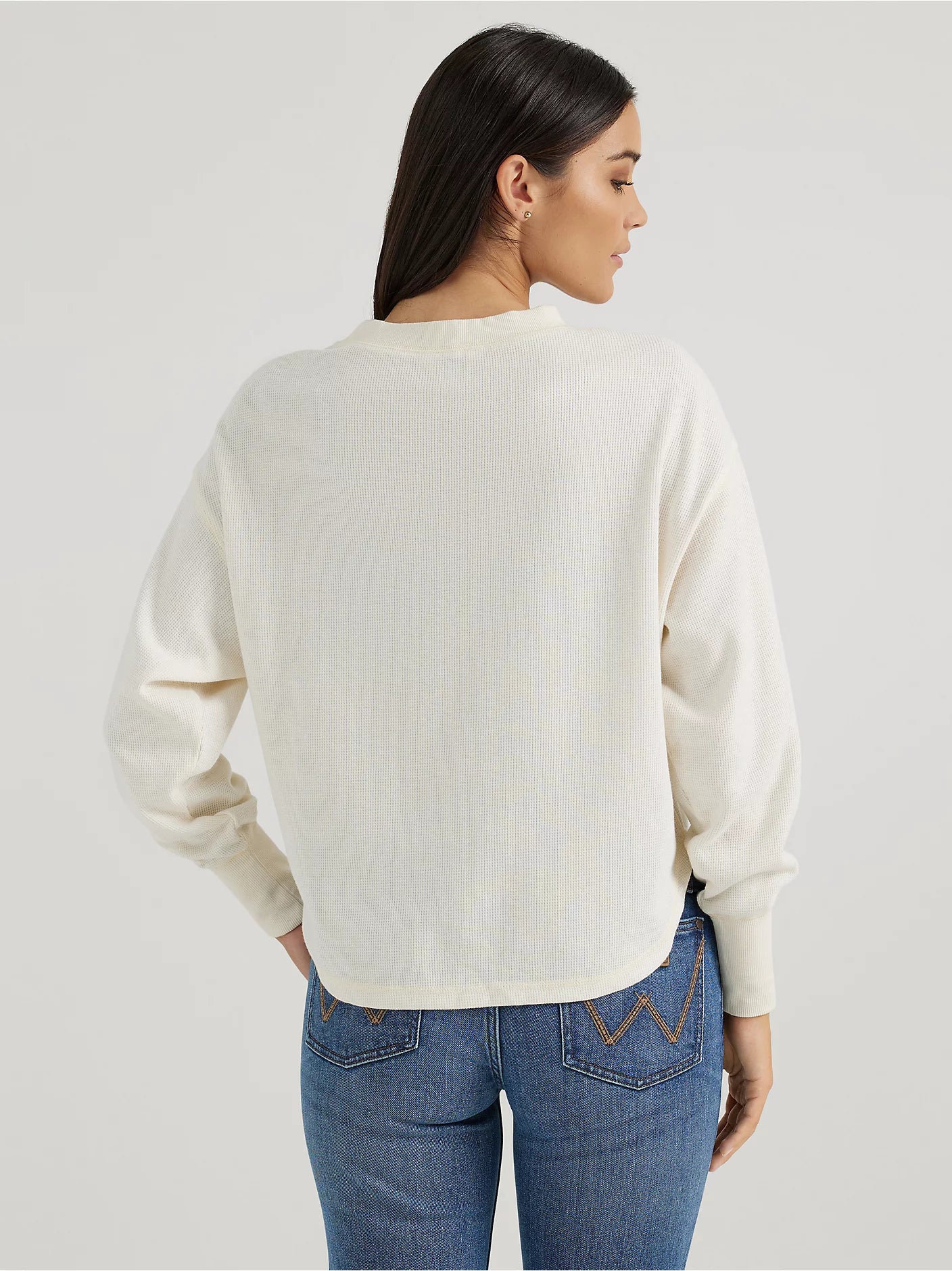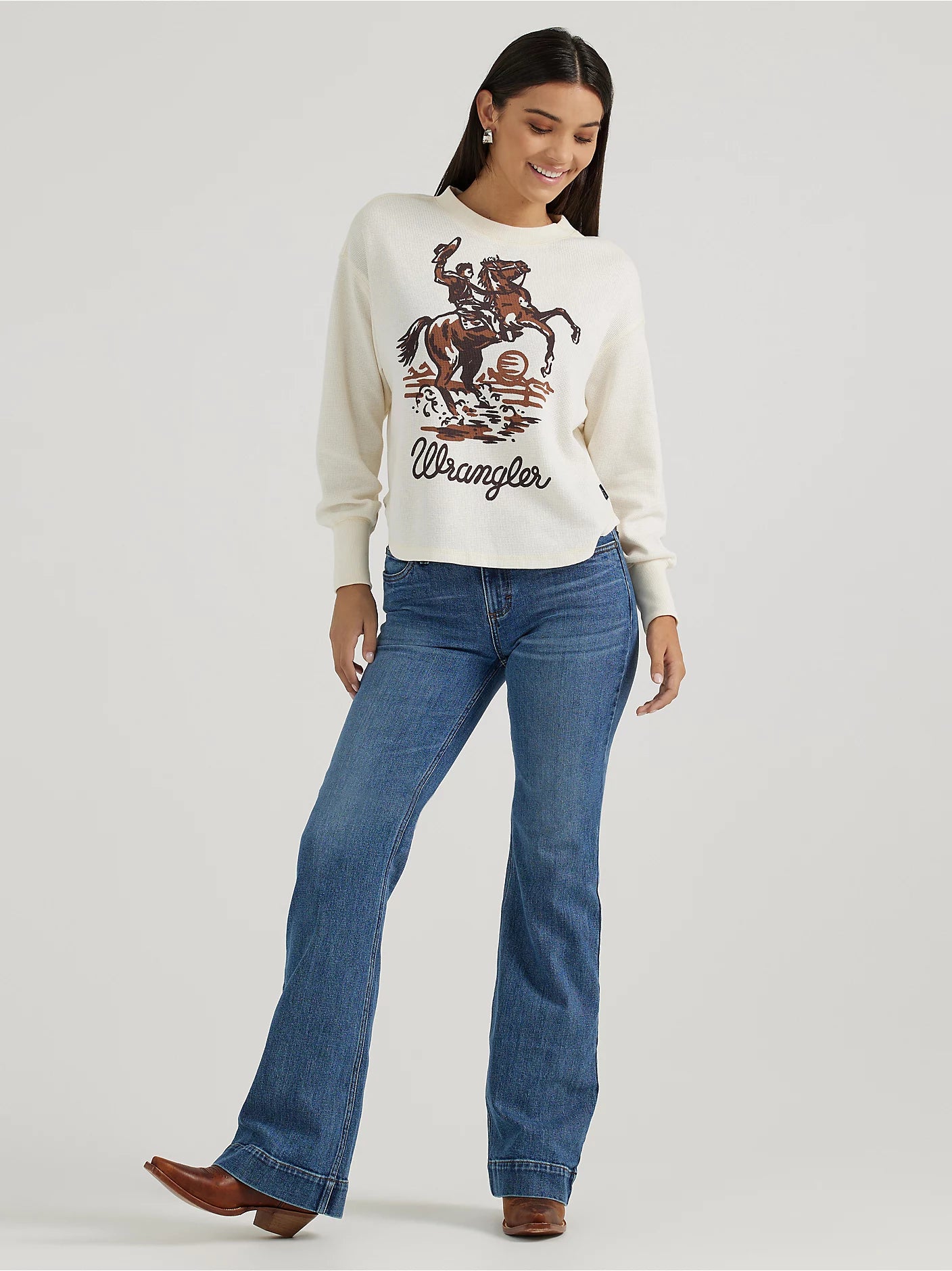 Crafted for warmth when cooler days arrive, the Women’s Wrangler Retro® Bucking Cowboy Waffle Thermal Shirt will become an easy favorite. It’s made of lightweight, waffle-textured fabric to keep you cozy. This classic crewneck also features a regular fit with dropped shoulders, a slightly cropped cut, and a retro-inspired graphic print of a bronc rider against a Western landscape along with the Wrangler® script logo for a touch of authenticity. 100% Acrylic Fabric