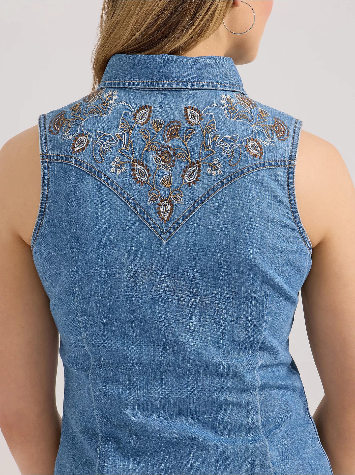 Wrangler® Women's Embellished Denim Sleeveless Snap Shirt 112361174